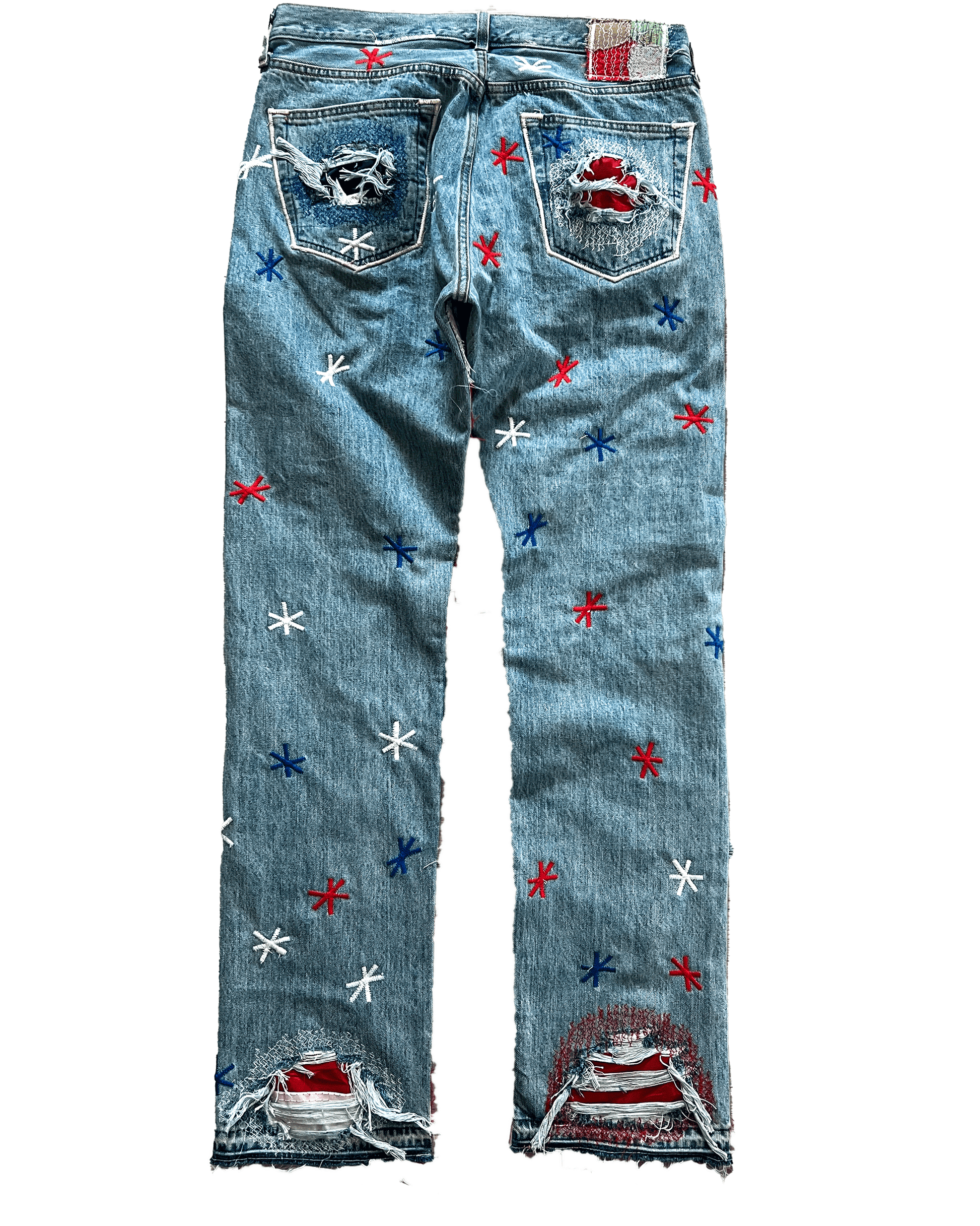 - PATCHWORK FLAG DETAILS ON FRONT OF DENIM
