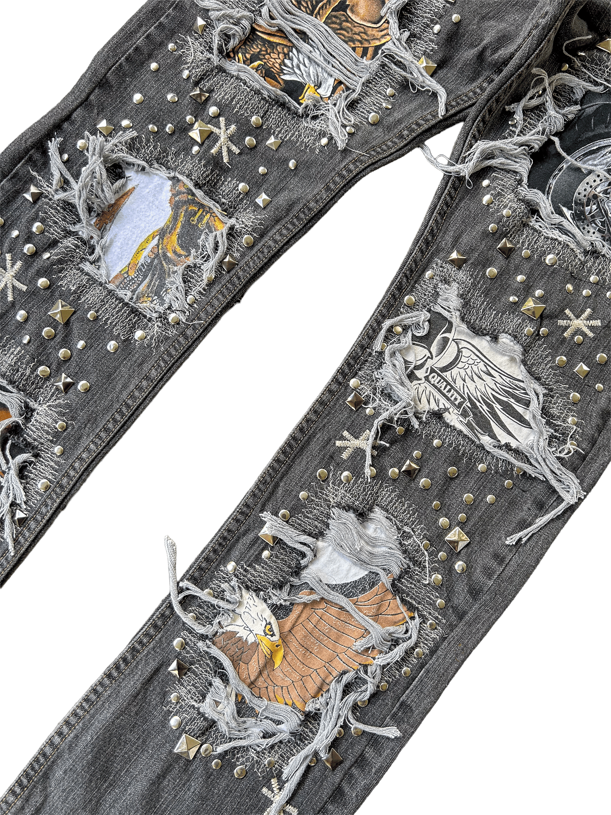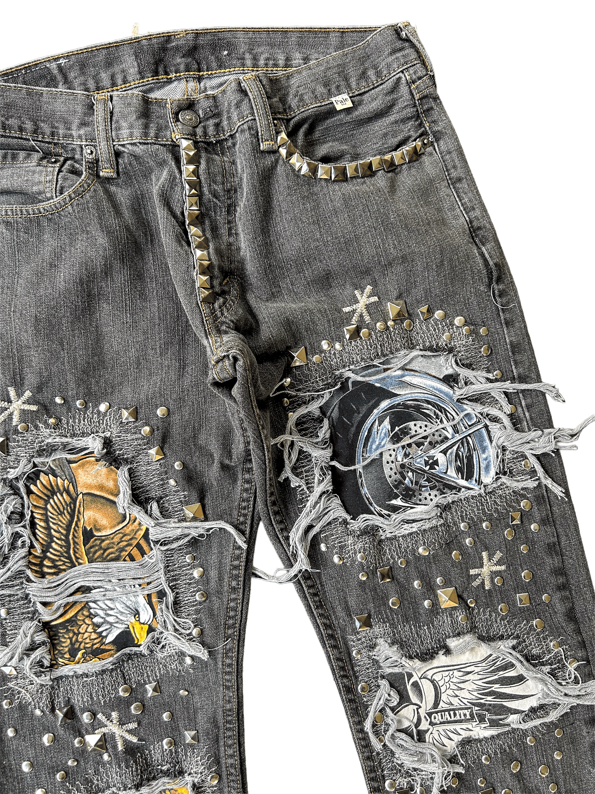 - DISTRESSING THROUGHOUT REVEALING LOCALLY SOURCED BIKER GRAPHICS WITH CHROME STITCHWORK REPAIR