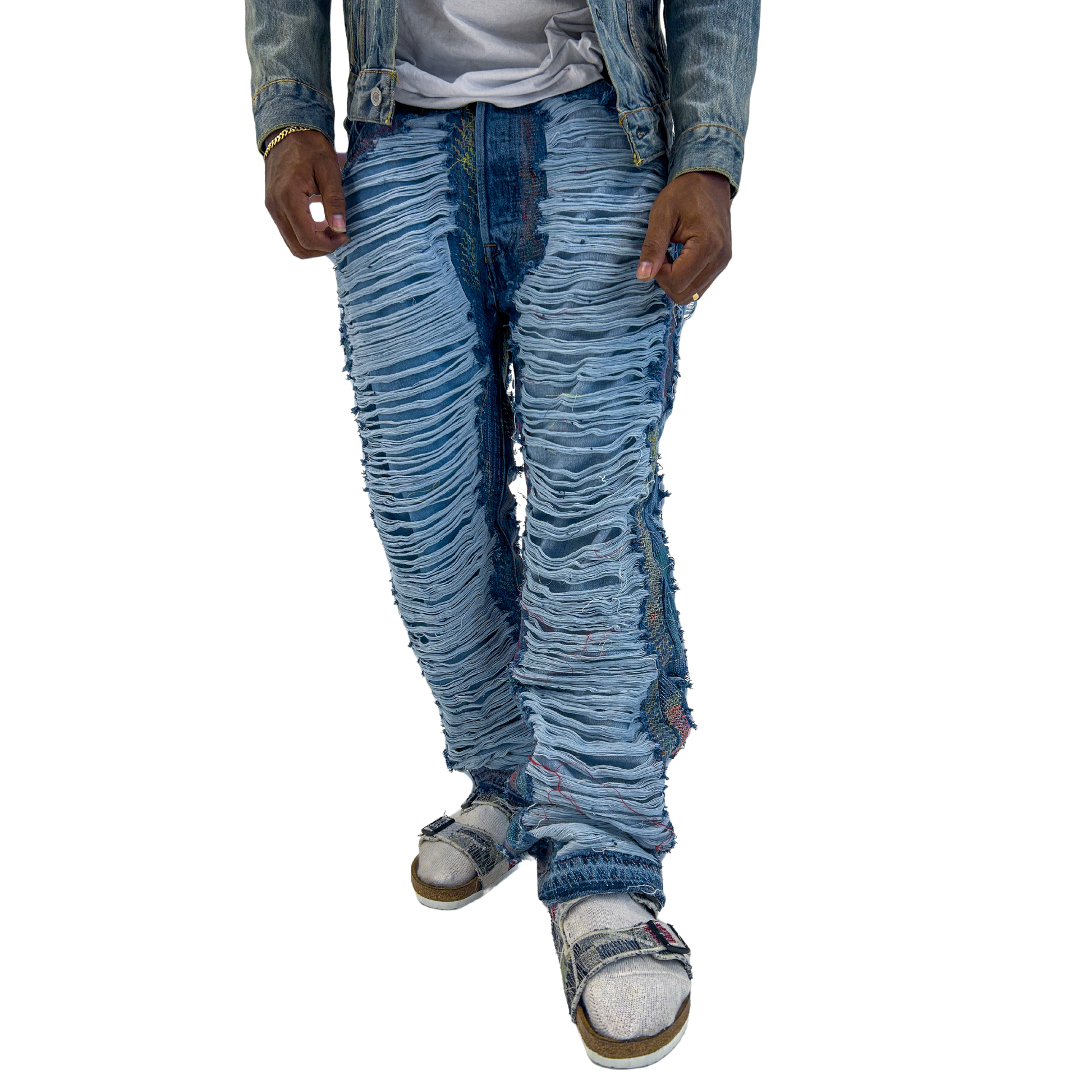 - FULLY DISTRESSED FRONT AND BACK WITH UNDERPATCH UNDERNEATH ALL PANELS