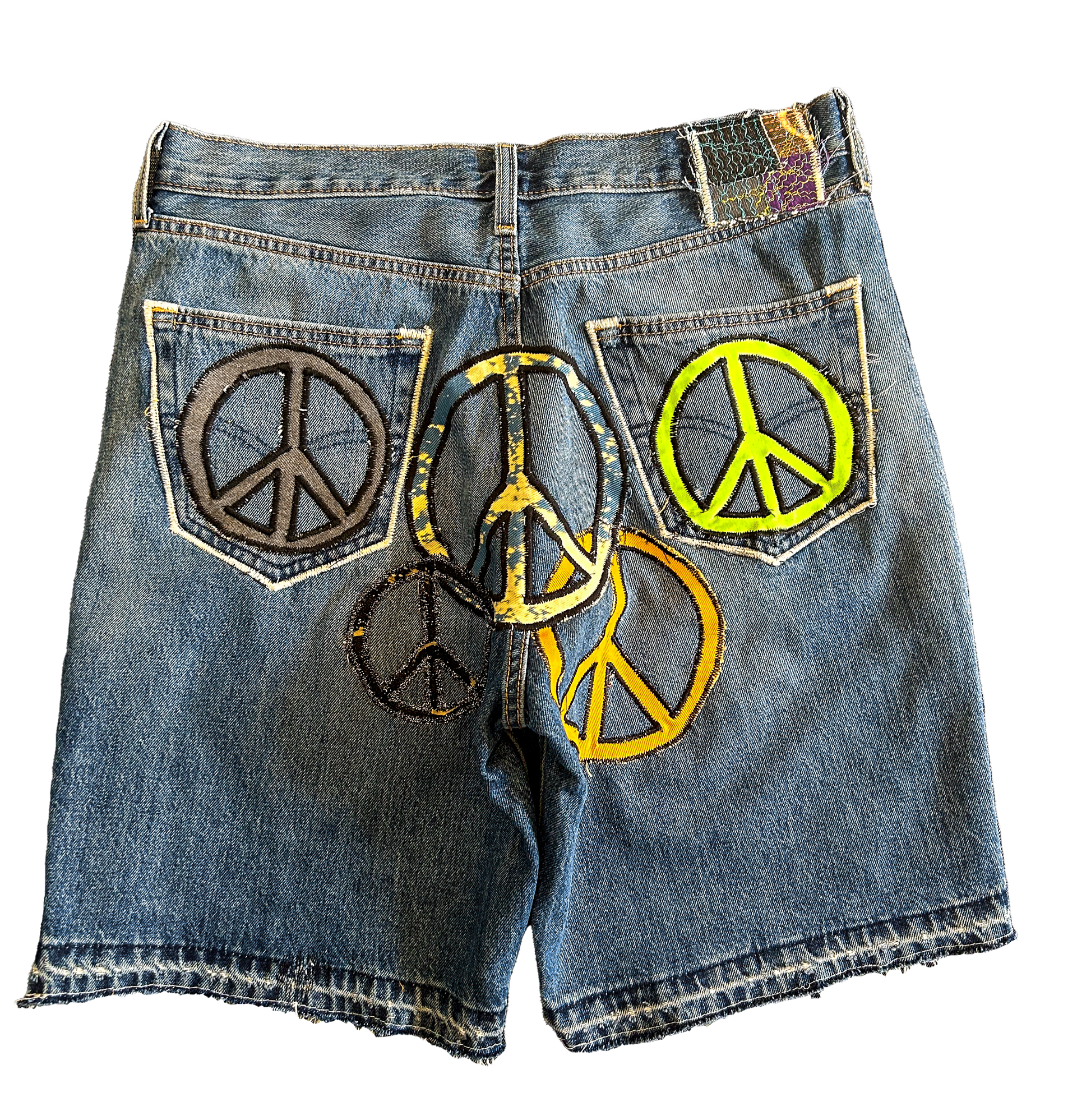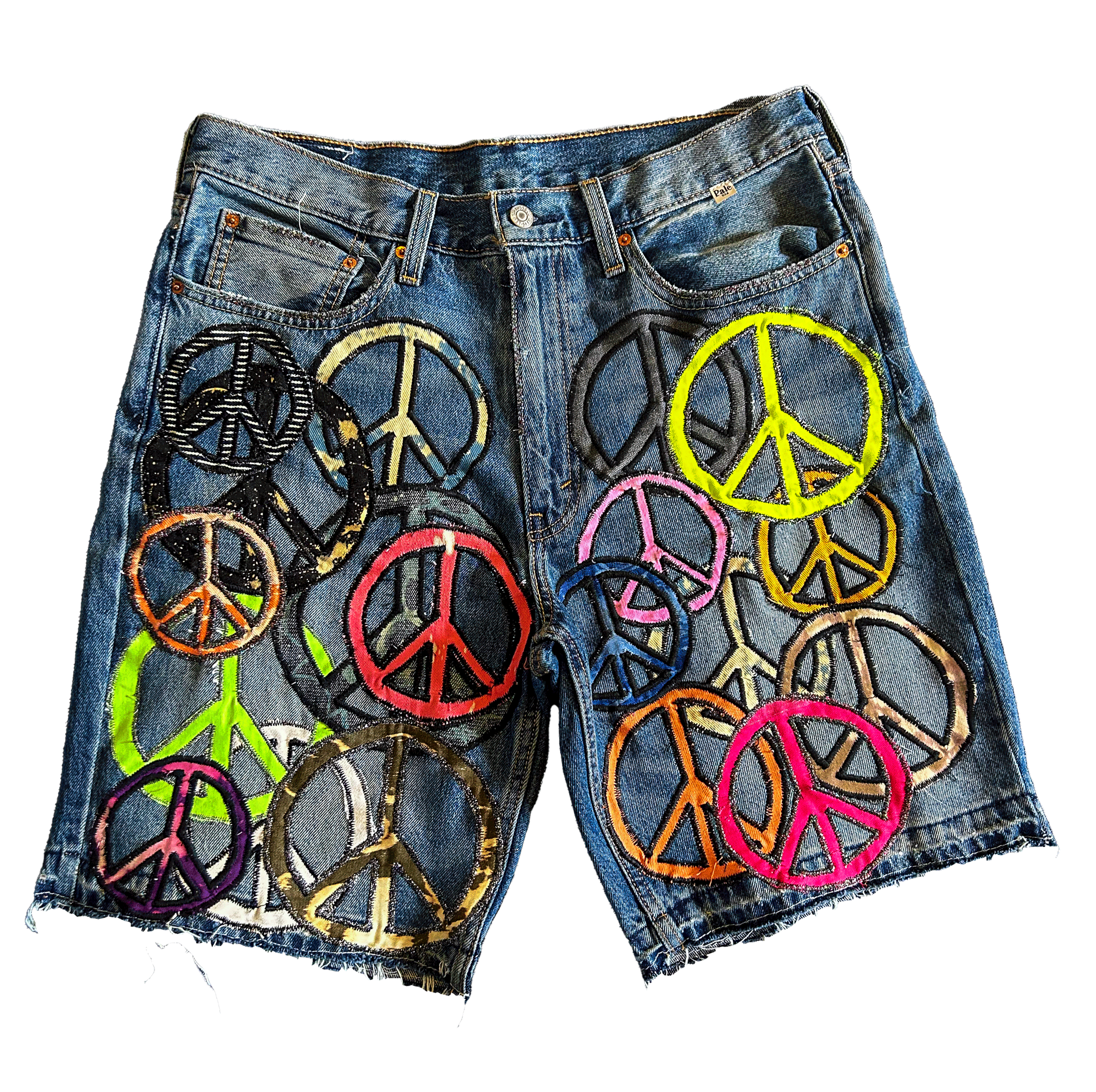 - MULTICOLOR PEACE MOTIFS PATCHED THROUGHOUT FRONT AND BACK WITH BLACK AND METALLIC CONTRAST EMBROIDERY STITCH