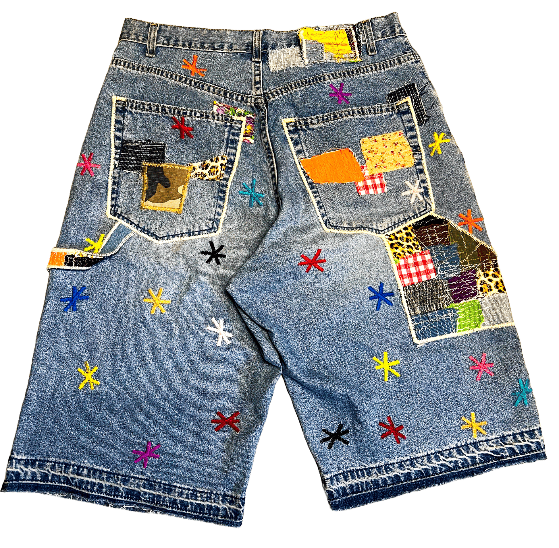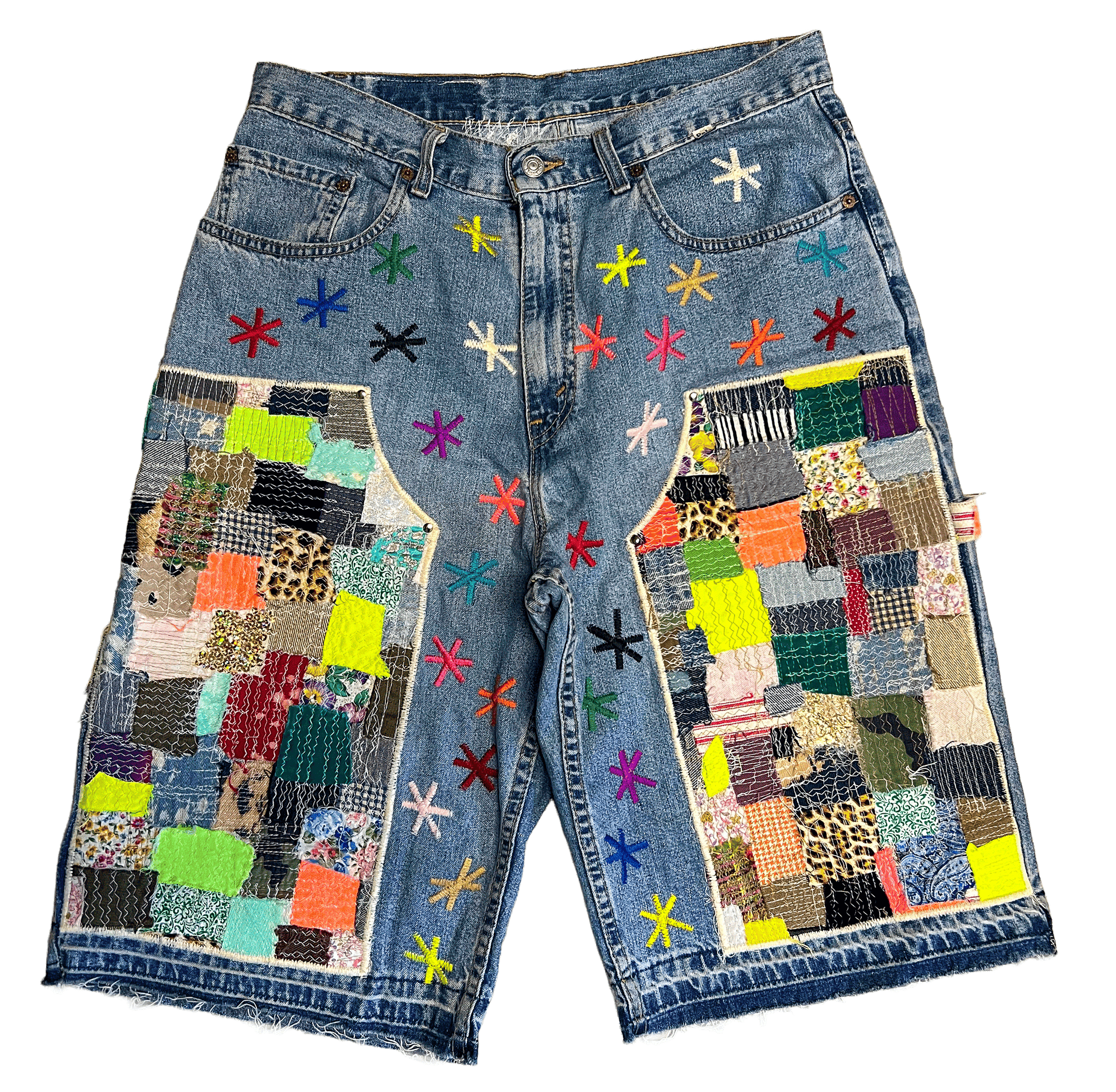 - SIGNATURE PATCHWORK TECHNIQUE INTEGRATED INTO DOUBLE KNEE PATTERN ON THE FRONT